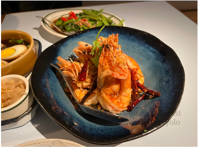 큼직한 왕새우를 살짝 튀겨 타마린드 소스와 고수, 고추를 곁들여 냅니다.