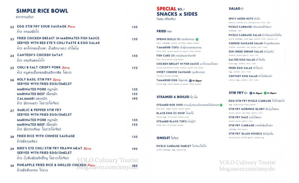 빨간 글씨로 표시된 스페셜 스낵&사이드 메뉴들은 모두 85바트로, 양도 적당하고 맛도 좋아 여러 가지를 주문해 나눠 먹기 좋습니다.
