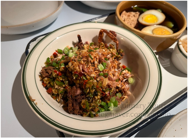 튀긴 샬롯과 파, 바늘이 더해져 감칠맛이 뛰어나고, 느끼하지 않고 깔끔한 뒷맛이 인상적입니다.